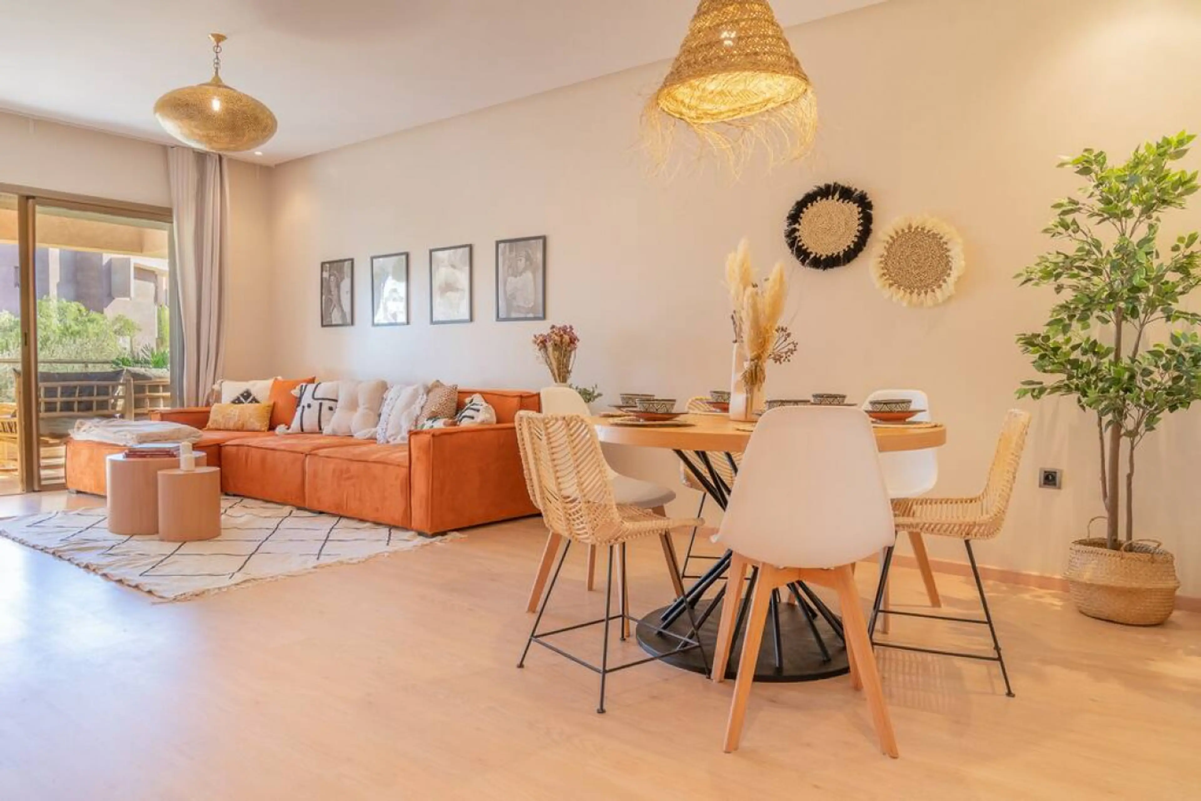 Charmant Appartement de 3 chambres avec terrasse aménagée, deux salles de bain, wifi, et cuisine toute équipée. Dans une résidence prestigieuse avec piscines, jardin et golf. Situé à : - 5 minutes du Menara Mall - 5 minutes du Centre commercial Al Mazar - 10 minutes du centres Situé dans une des mei...