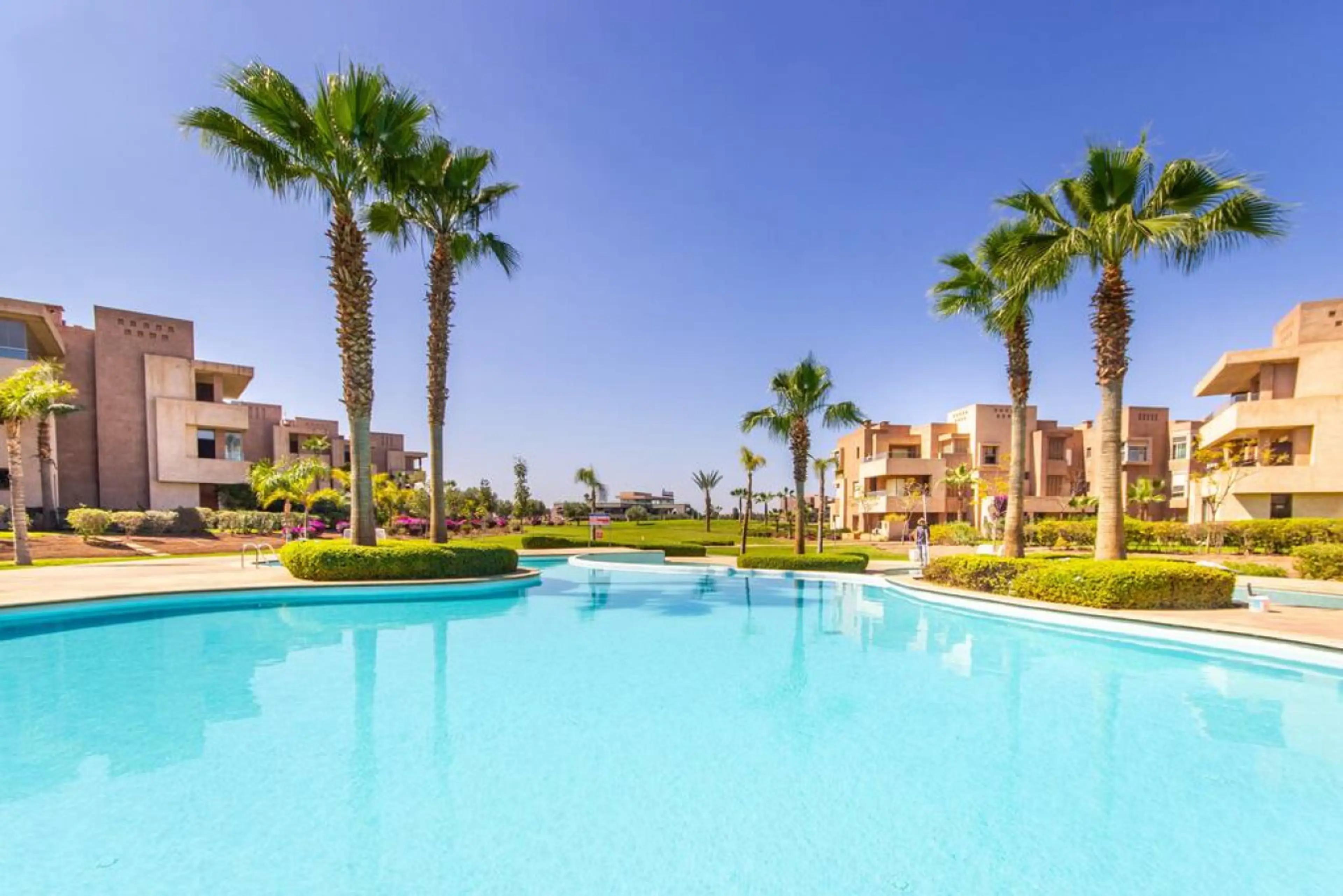Charmant Appartement de 2 chambres avec terrasse aménagée en rez de jardin, deux salles de bain, wifi, et cuisine toute équipée. Dans une résidence prestigieuse avec piscines, jardin et golf. Situé à : - à quelques pas Montgomerie Mami's Burger - 5 minutes du Menara Mall - 5 minutes du Centre commer...