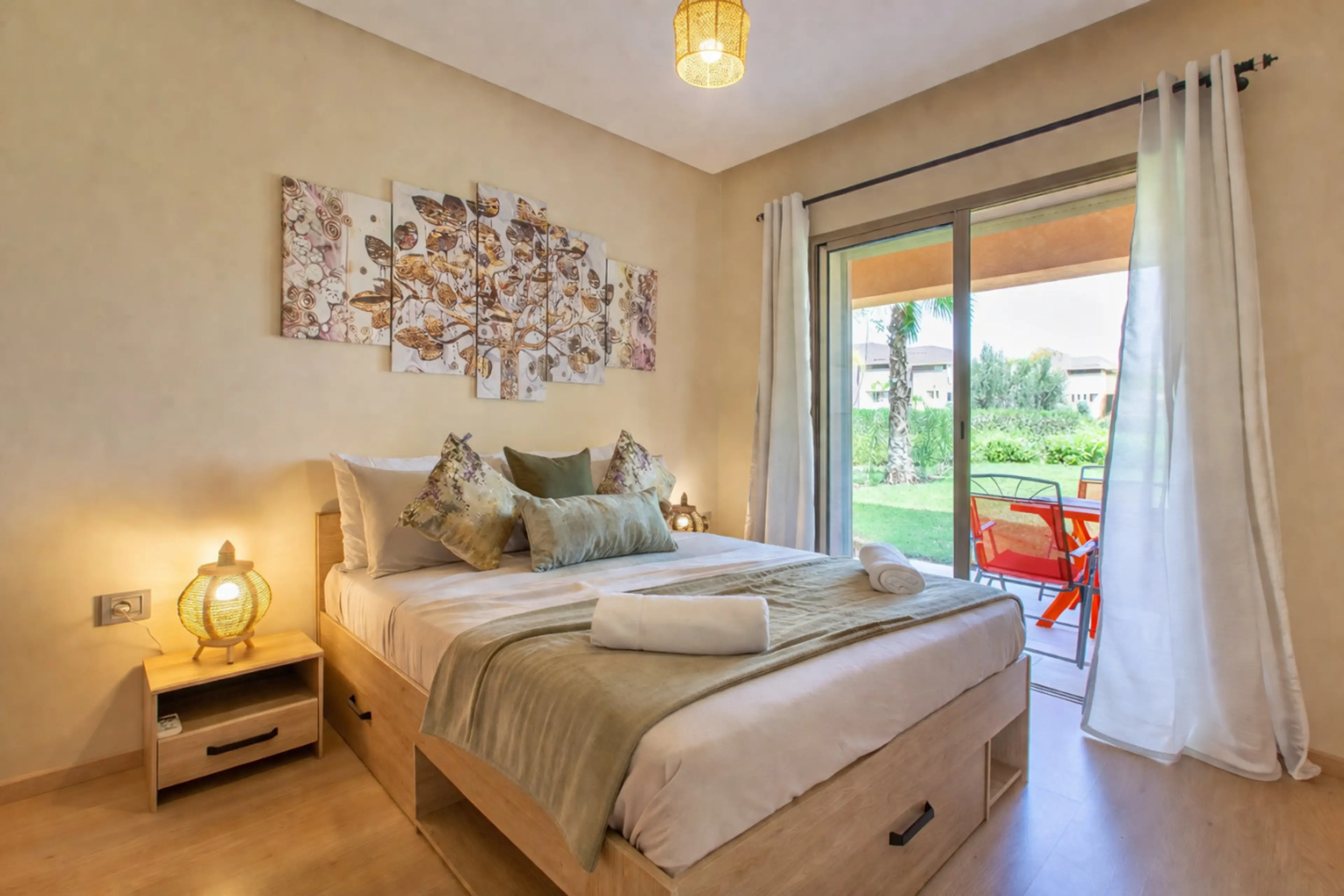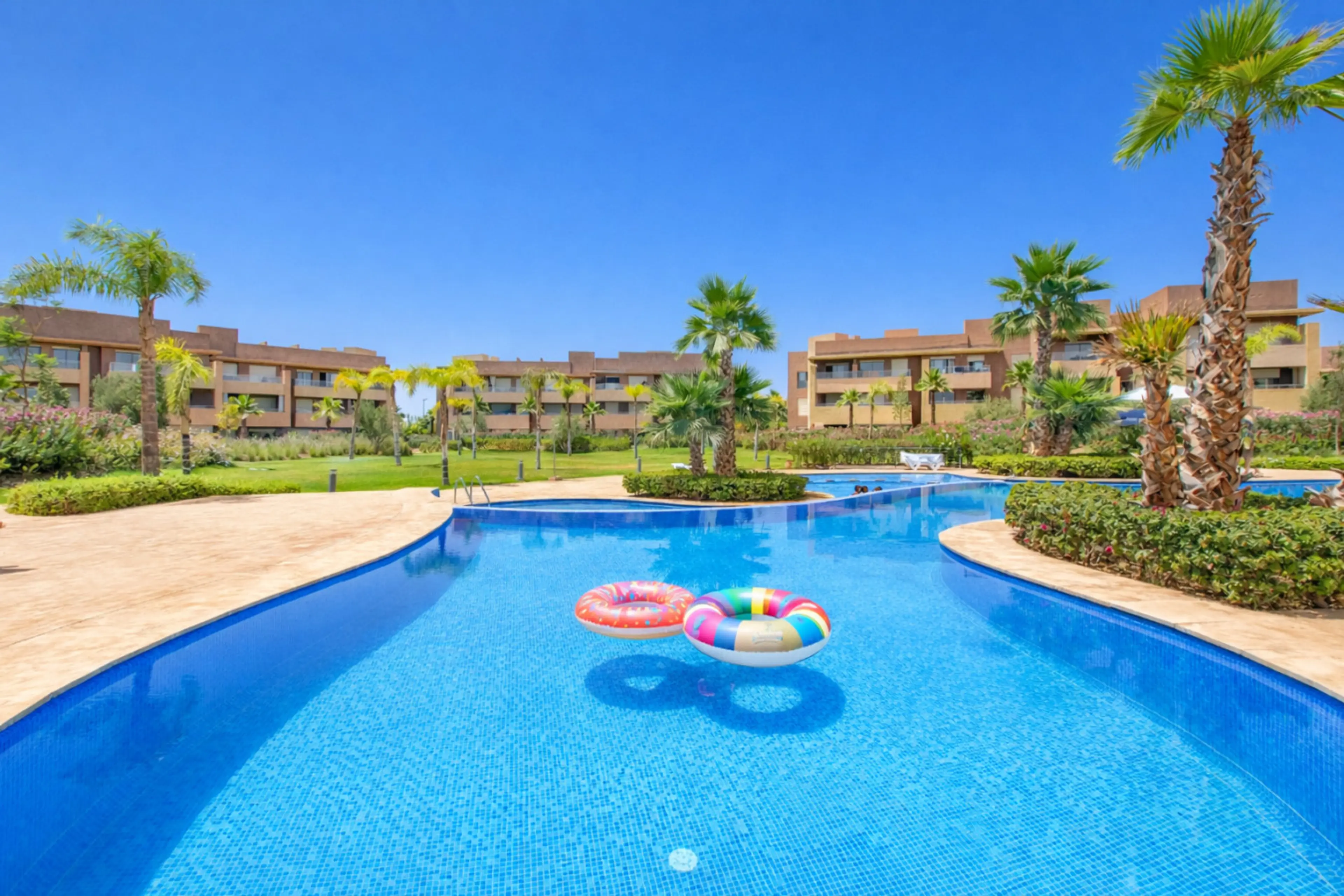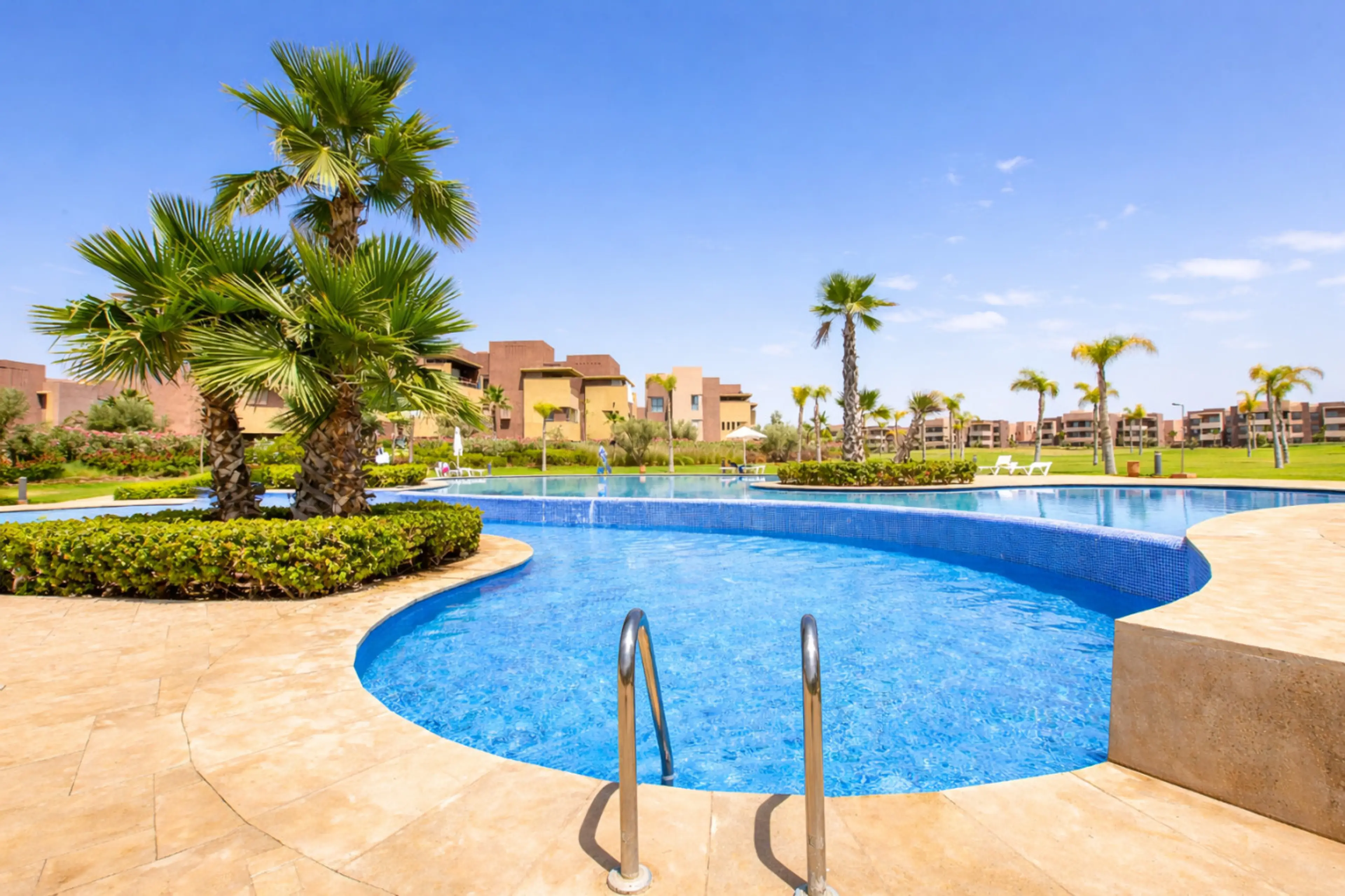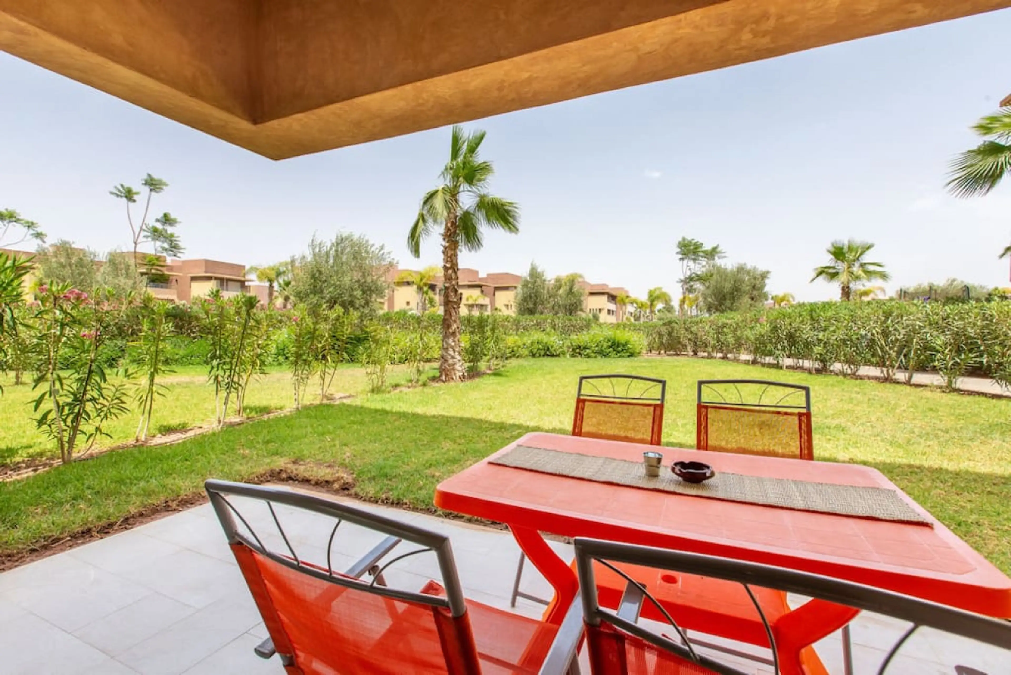 Appartement de 2 chambres avec terrasse aménagée en rez de jardin, deux salles de bain, wifi, et cuisine toute équipée. Dans une résidence prestigieuse avec piscines, jardin et golf. Situé à : - à quelques pas Montgomerie Mami's Burger - 5 minutes du Menara Mall - 5 minutes du Centre commercial Al M...