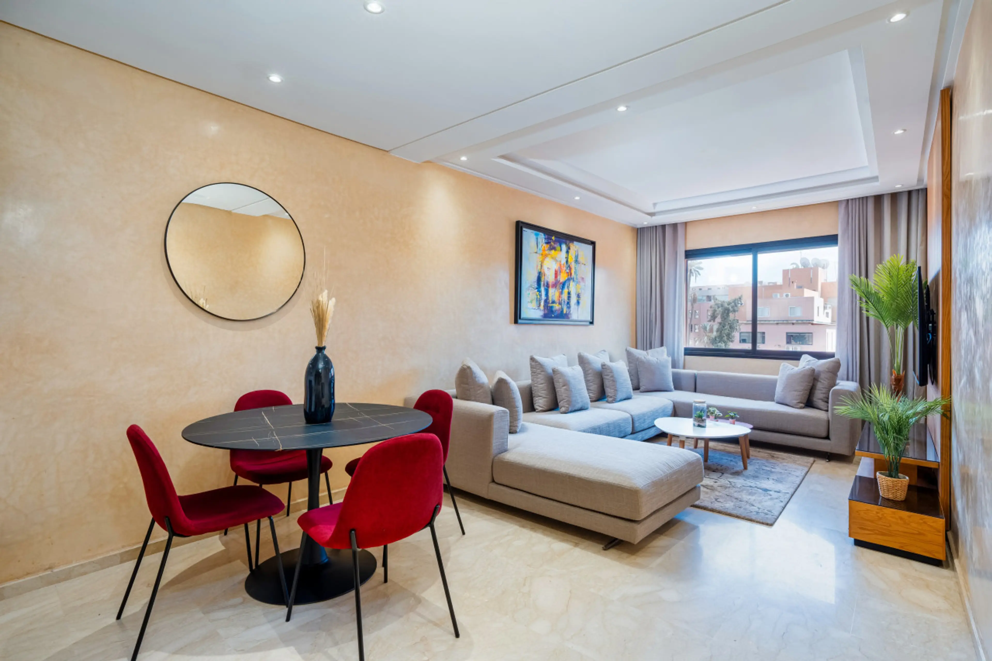 Wonderful weeklong stay in this apartment! The apartment is located in a perfect spot a couple of blocks from a busy street with cafes, shops, grocery stores, restaurants, night life, and easy access to some of the touristy things in Marrakech. The apartment was great, and exactly as described. No issues with the wifi, air conditioning, washer, etc. Everything was great and as expected.