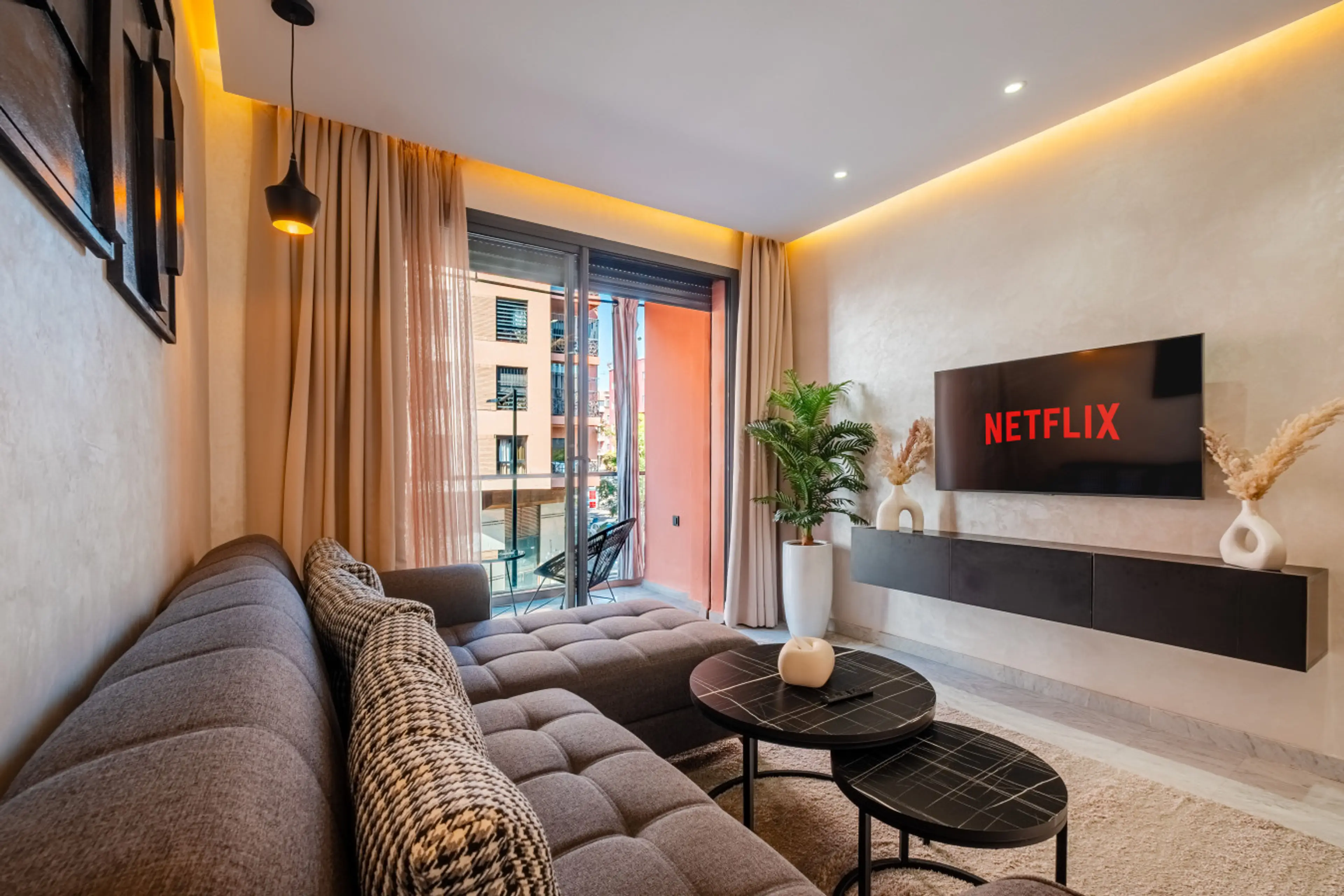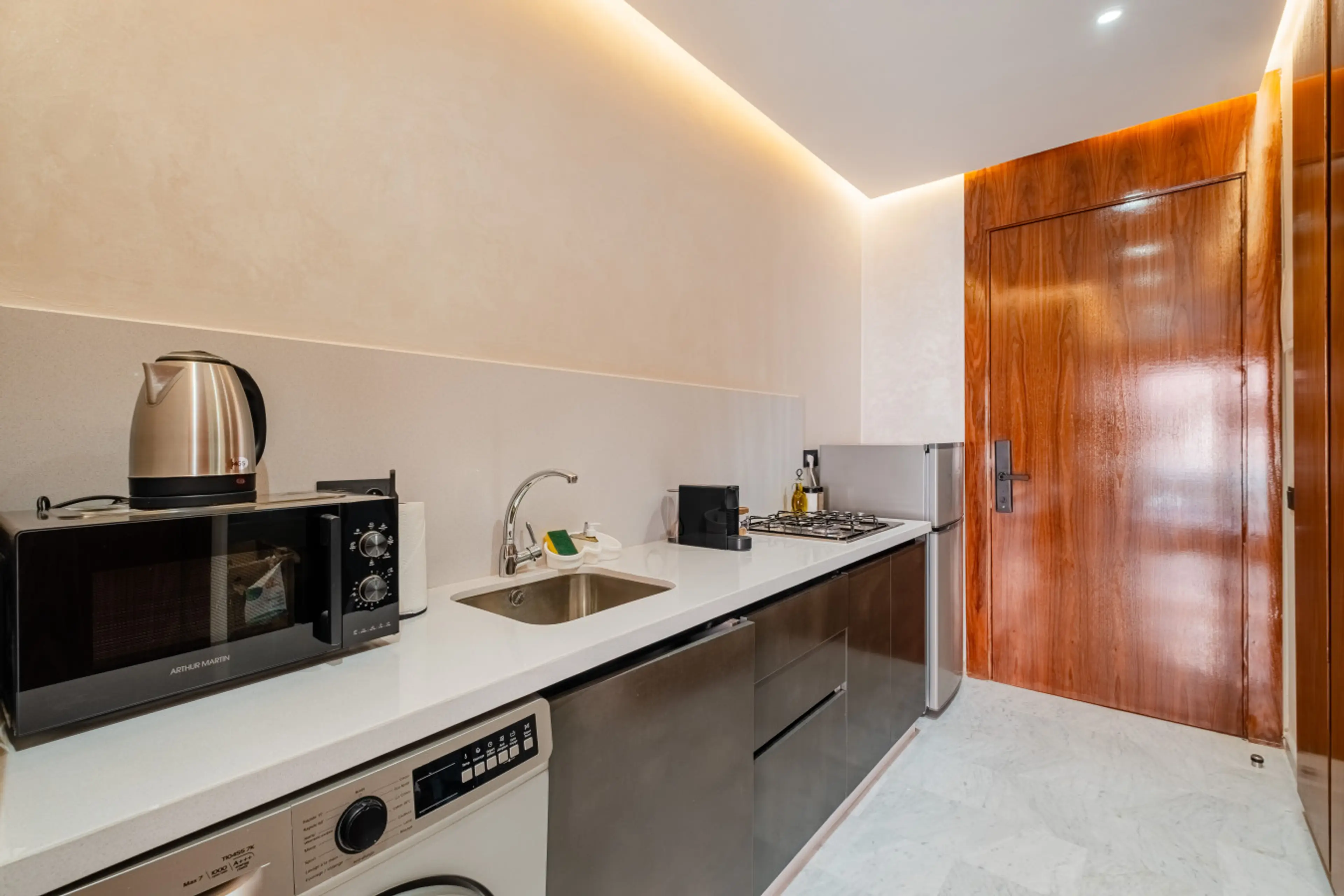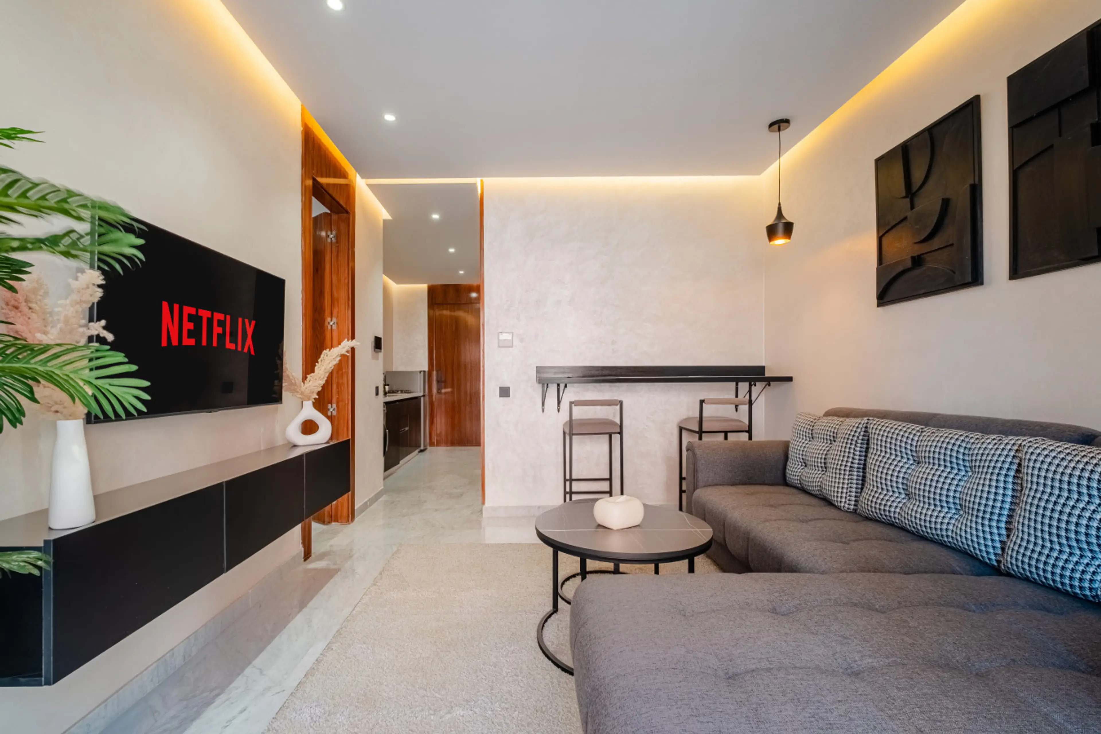 Profitez d’un séjour confortable dans ce magnifique appartement une chambre, lumineux, propre et parfaitement entretenu, situé dans une résidence haut standing avec surveillance 24/7 et caméras de sécurité. L’appartement dispose d’un lit double climatisé, d’une télévision dans le salon et dans la c...